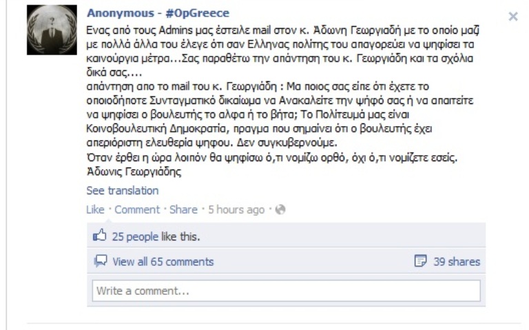 Σύμφωνα με την σελίδα των Ελλήνων Anonymous στο Facebook , ένας από τους διαχειριστές της, έστειλε mail στον Άδωνι Γεωργιάδη, ζητώντας του να καταψηφίσει τα νέα μέτρα.