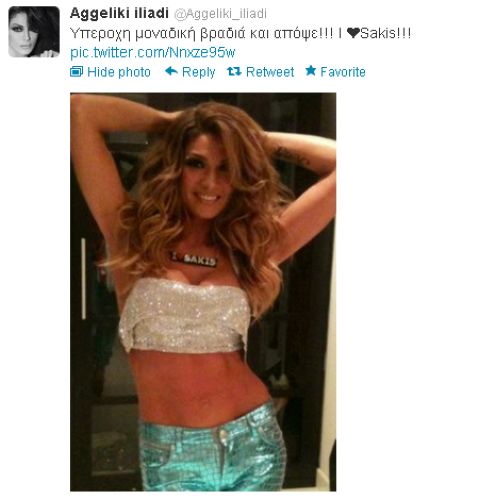 Μάλιστα, η ίδια ανέβασε τη φωτογραφία με το κολιέ στο twitter, με το σχόλιο «υπέροχη μοναδική βραδιά και απόψε! I love Sakis!!!».