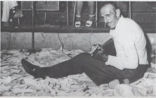 Ο Γιάννης Παπαϊωάννου παίζει μπουζούκι στο πάτωμα. Γύρω του... σπασμένα πιάτα