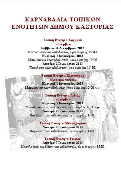 ΚΑΡΝΑΒΑΛΙΑ ΤΟΠΙΚΩΝ ΕΝΟΤΗΤΩΝ ΔΗΜΟΥ ΚΑΣΤΟΡΙΑΣ Τοπική Ενότητα Κορησού «Σούρβα» Σάββατο 31 Δεκεμβρίου 2012 Μπουλούκια καρναβαλιστών, ώρα έναρξης 19:00. Κυριακή 1 Ιανουαρίου 2013 Μπουλούκια καρναβαλιστών, ώρα έναρξης 19:00 Δευτέρα 2 Ιανουαρίου 2013 Παρέλαση καρναβαλιστών, ώρα έναρξης 15:30. Τοπική Ενότητα Κλεισούρας «Αργκουτσάρια»Κυριακή 1 Ιανουαρίου 2013 Μπουλούκια καρναβαλιστών, ώρα έναρξης 10:00 π.μ. Τοπική Ενότητα ΛιθιάςΚυριακή 1 Ιανουαρίου 2013 Μπουλούκια καρναβαλιστών, ώρα έναρξης 11:30π.μ. Παρέλαση καρναβαλιστών, ώρα έναρξης 15:00. Τοπική Ενότητα Μαυροχωρίου Δευτέρα 2 Ιανουαρίου 2013 Παρέλαση καρναβαλιστών, ώρα έναρξης 14:00. Τοπική Ενότητα Τοιχιού Δευτέρα 7 Ιανουαρίου 2013 Μπουλούκια-παρέλαση καρναβαλιστών, ώρα έναρξης 15:00. ΔΗΜΟΤΙΚΗ ΕΝΟΤΗΤΑ ΚΑΣΤΟΡΙΑΣ ΡΑΓΚΟΥΤΣΑΡΙΑ 2013 6-7 & 8 ΙΑΝΟΥΑΡΙΟΥ Σάββατο 5 Ιανουαρίου 2013: Έναρξη του Καστοριανού καρναβαλιού από τη Δημοτική αρχή. Αφετηρία Δημαρχιακό Μέγαρο ώρα 16:00, με προορισμό την πλατεία Ομονοίας. Κυριακή 6 Ιανουαρίου 2013 Θεοφάνεια: