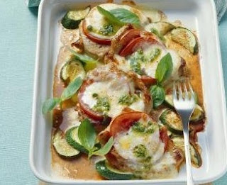 Προετοιμασία: Προθερμαίνουμε το φούρνο στους 180οC. Ζεσταίνουμε το ελαιόλαδο σε ένα μεγάλο τηγάνι πάνω σε μέτρια φωτιά. Τσιγαρίζουμε τα φιλέτα για 1-2 λεπτά κάθε πλευρά και τα τοποθετούμε σε πυρίμαχο σκεύος. Προσθέσουμε πάνω από τα φιλέτα τη μοτσαρέλα, το κολοκύθι και τις ντομάτες. Αλατοπιπερώνουμε και βάζουμε σε διάφορα σημεία πάνω στα υλικά την σάλτσα πέστο. Περιχύνουμε ομοιόμορφα πάνω από όλα τα υλικά την φρέσκα κρέμα και σκεπάζουμε τα σκεύος. Ψήνουμε στο φούρνο για 25-30 λεπτά. Τα τελευταία πέντε λεπτά ξεσκεπάζουμε και συνεχίζουμε το ψήσιμο.