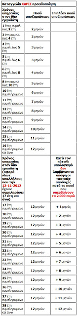 Ο πρωθυπουργός, Αντώνης Σαμαράς, ανέφερε χαρακτηριστικά ότι το προσωπικό, που θα απολυθεί, θα αποζημιωθεί γενναιόδωρα. Πρακτικά κάτι τέτοιο σημαίνει, σύμφωνα με την εργατολόγο, Μαρλέν Ασημακοπούλου, ότι τίθεται σε ισχύ ο νόμος 4093 του 2012, που ορίζει ποσά αποζημιώσεων ανάλογα με αυτά του ιδιωτικού τομέα, καθώς πρόκειται για συμβάσεις ιδιωτικού δικαίου αορίστου χρόνου, οι οποίες εντάσσονται στο καθεστώς απόλυσης χωρίς προειδοποίηση.